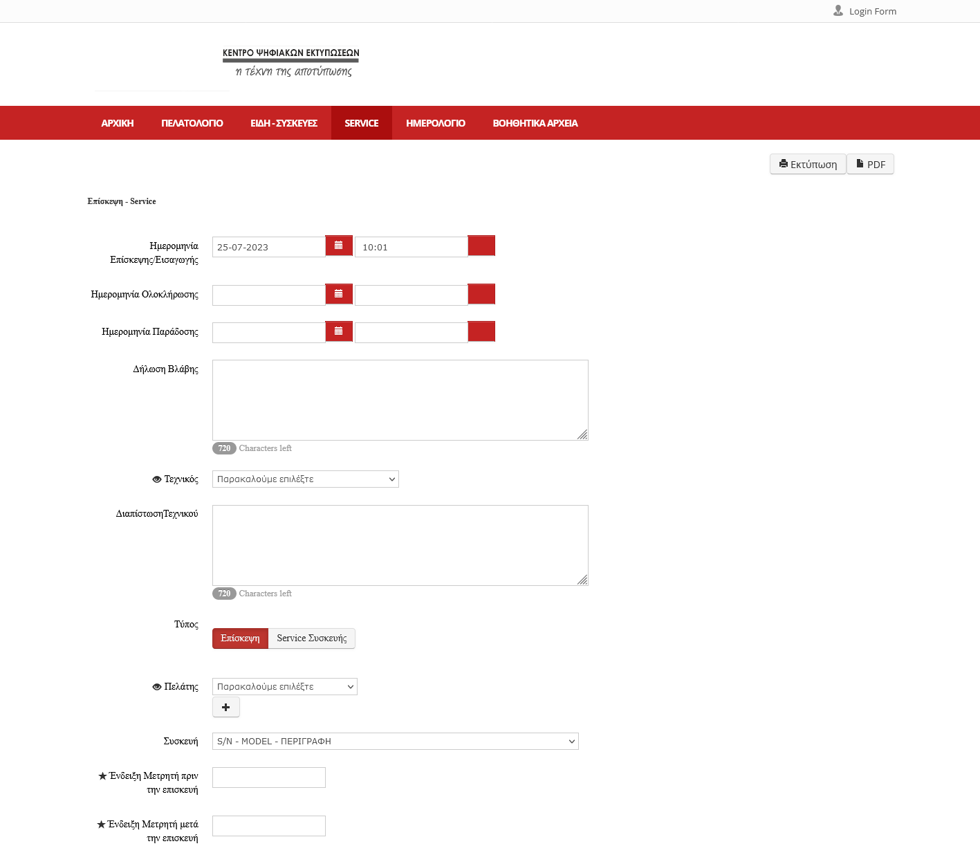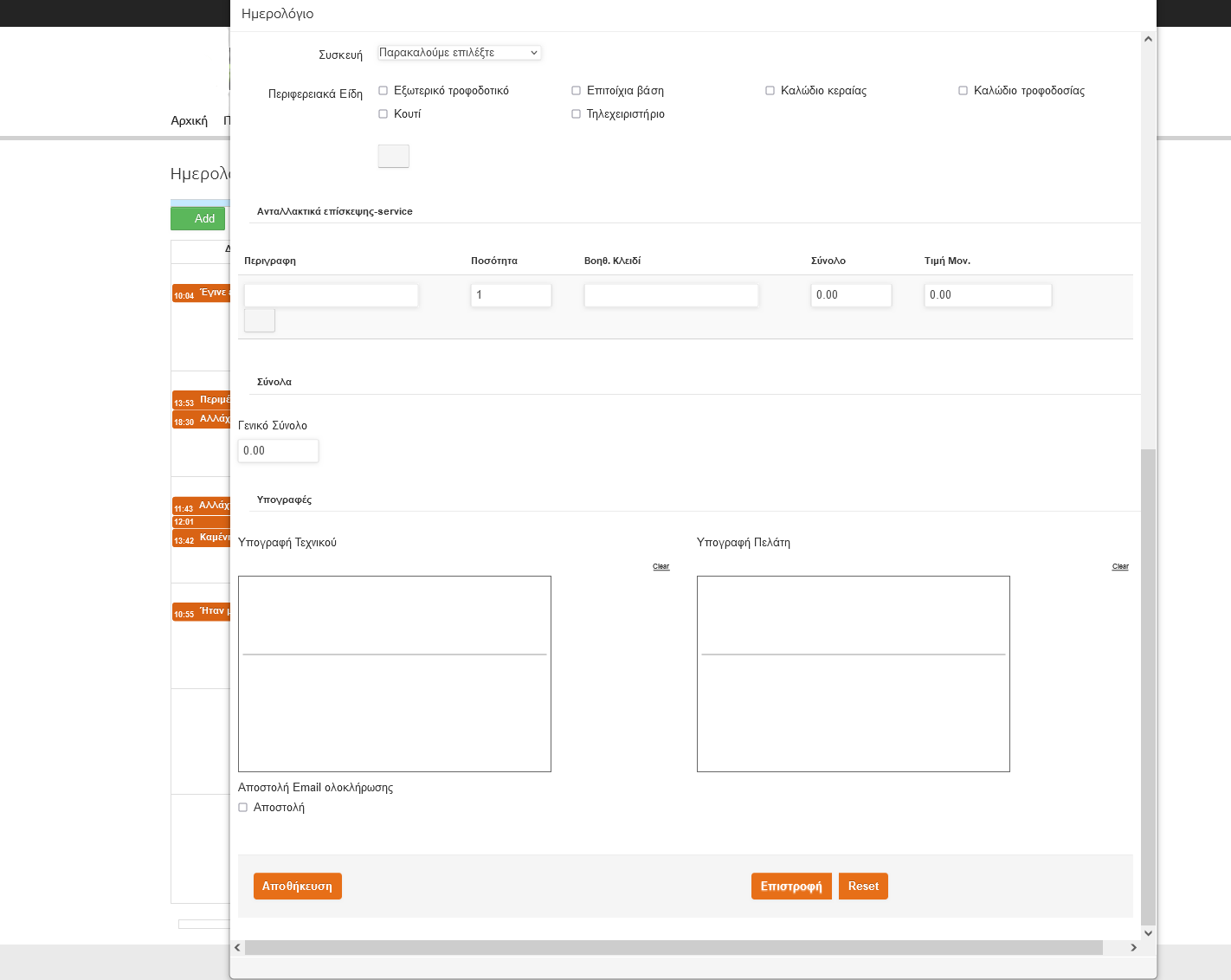 Εισαγωγή Επίσκεψης ή επιτόπιου servis με καταχώρηση ημερομηνιών εισαγωγής, ελέγχου, ολοκλήρωσης, παράδοσης, τεχνικού, εκτίμηση κόστους με εισαγωγή ανταλλακτικών και άλλων δεδομένων.