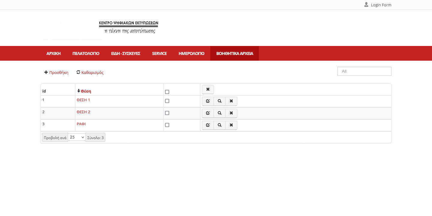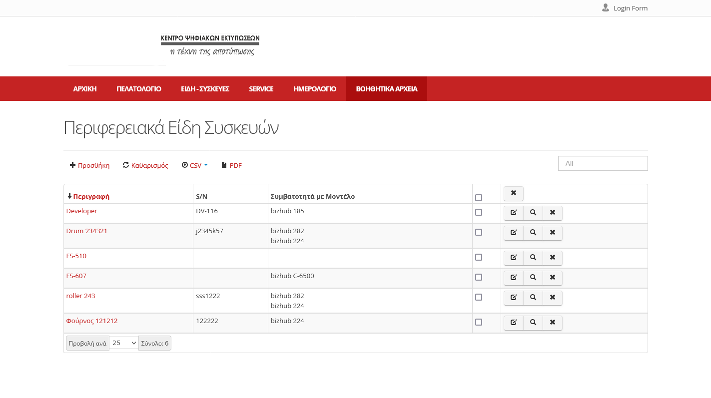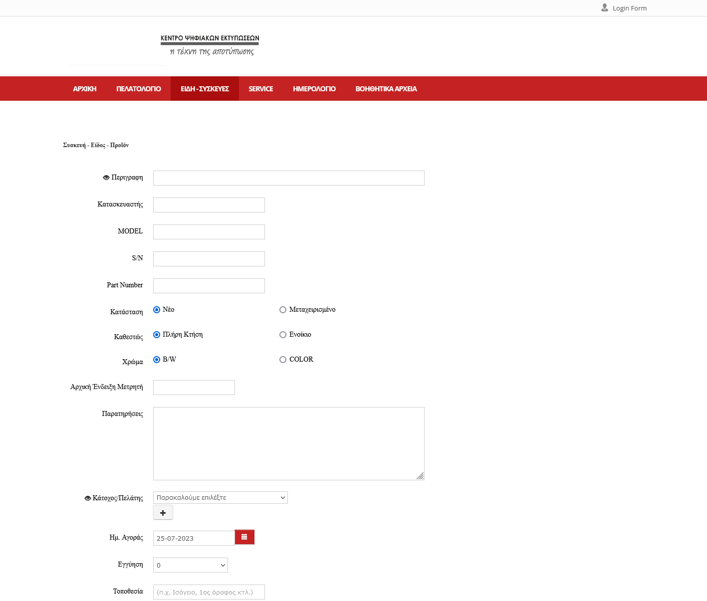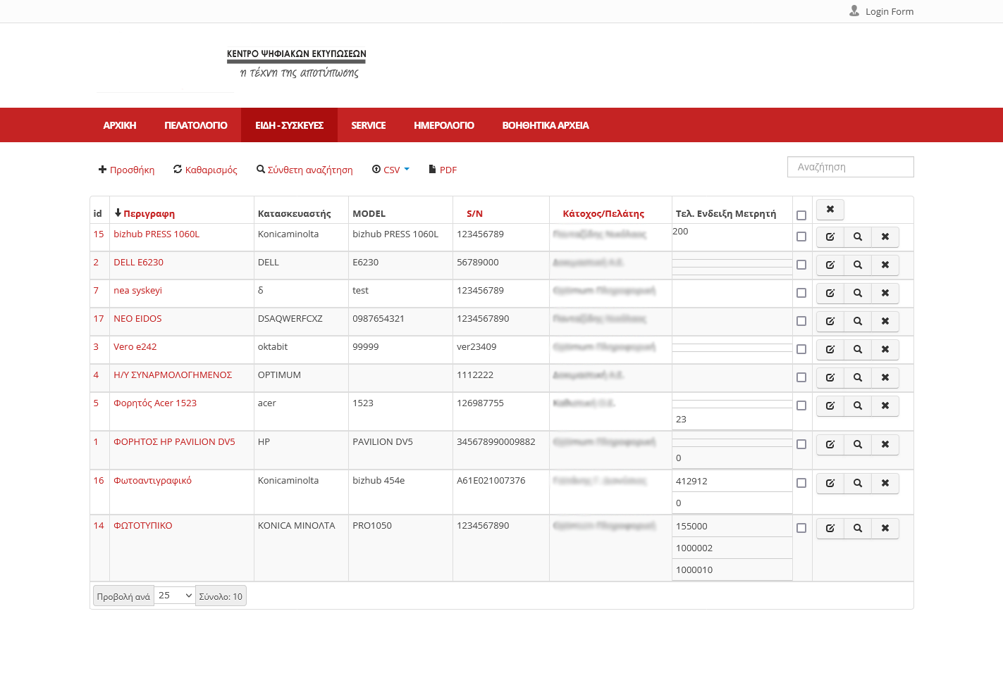 Καταχώρηση Φωτοτυπικών – Eκτυπωτών - Μηχανών Γραφείου με τα απαραίτητα στοιχεία (S/N, model, part number κτλ) και αντιστοίχιση στον πελάτη