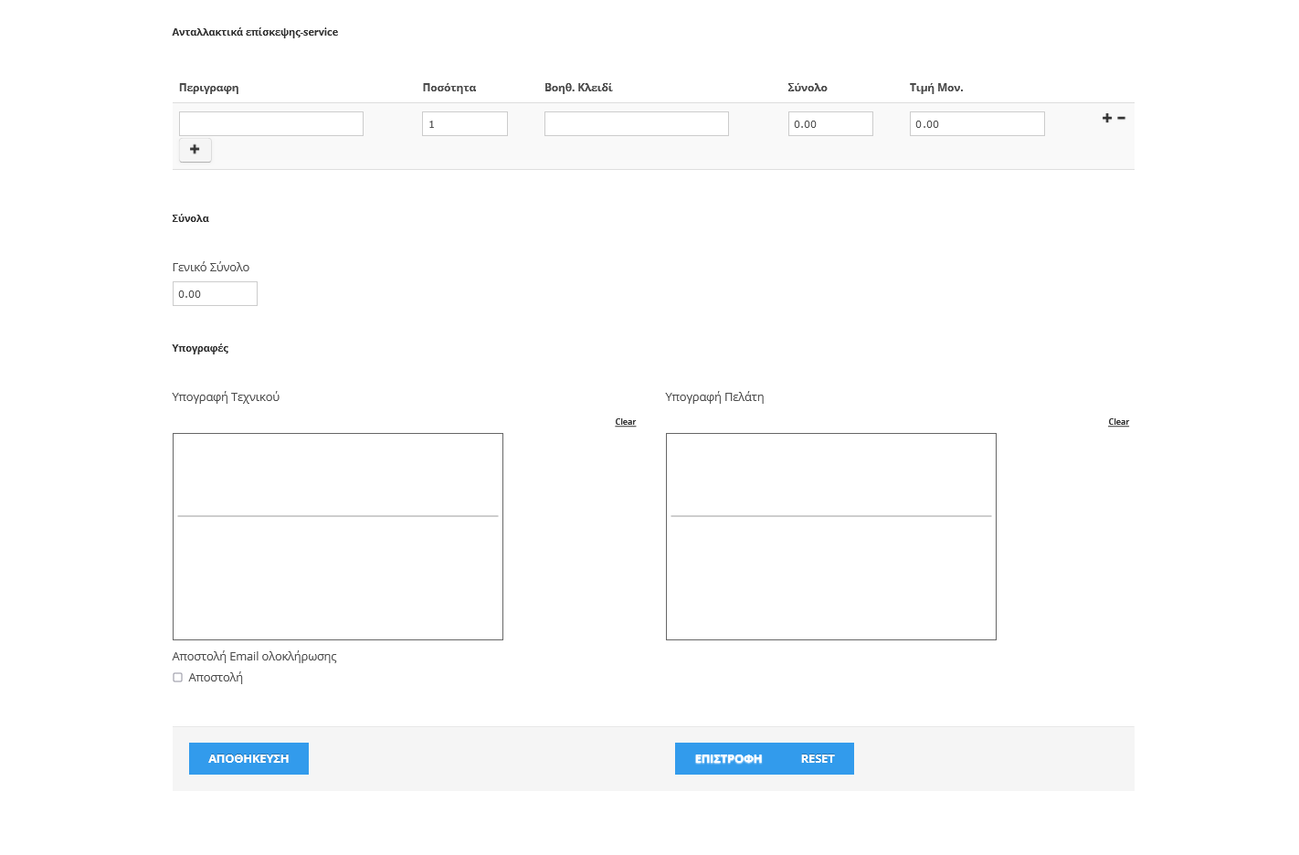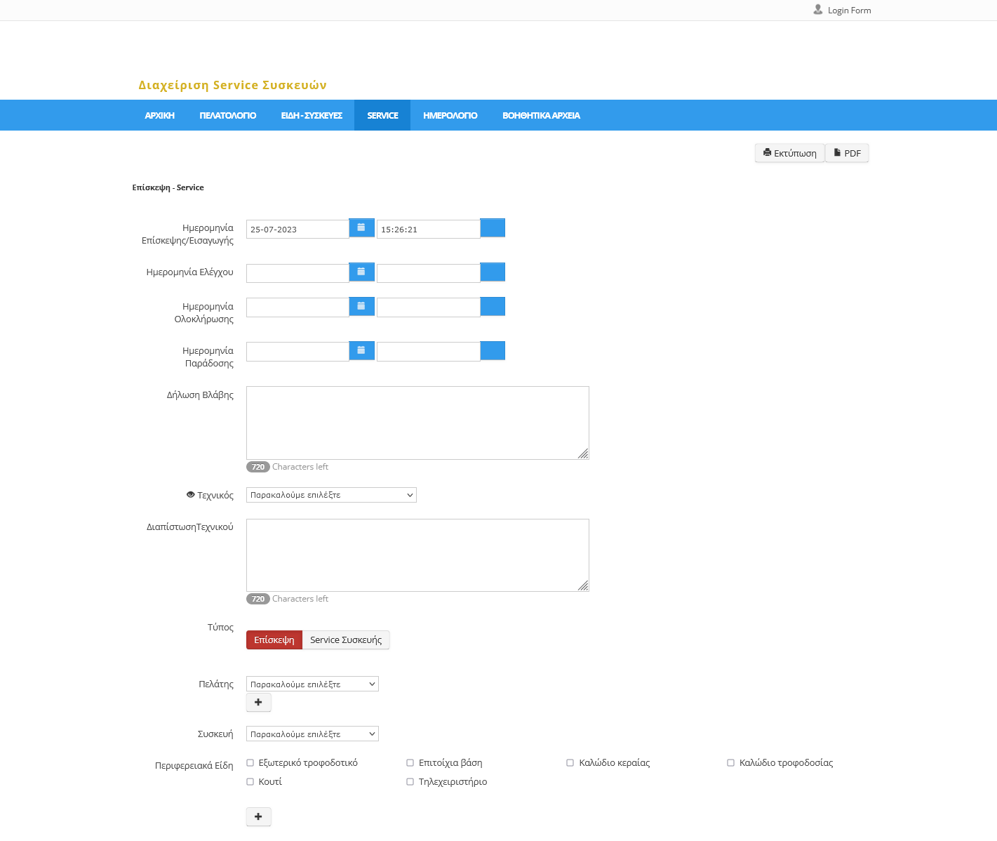 Εισαγωγή επίσκεψης ή επιτόπιου servis με καταχώρηση ημερομηνιών εισαγωγής, ελέγχου, ολοκλήρωσης, παράδοσης, τεχνικού, εκτίμηση κόστους με εισαγωγή ανταλλακτικών και άλλων δεδομένων.