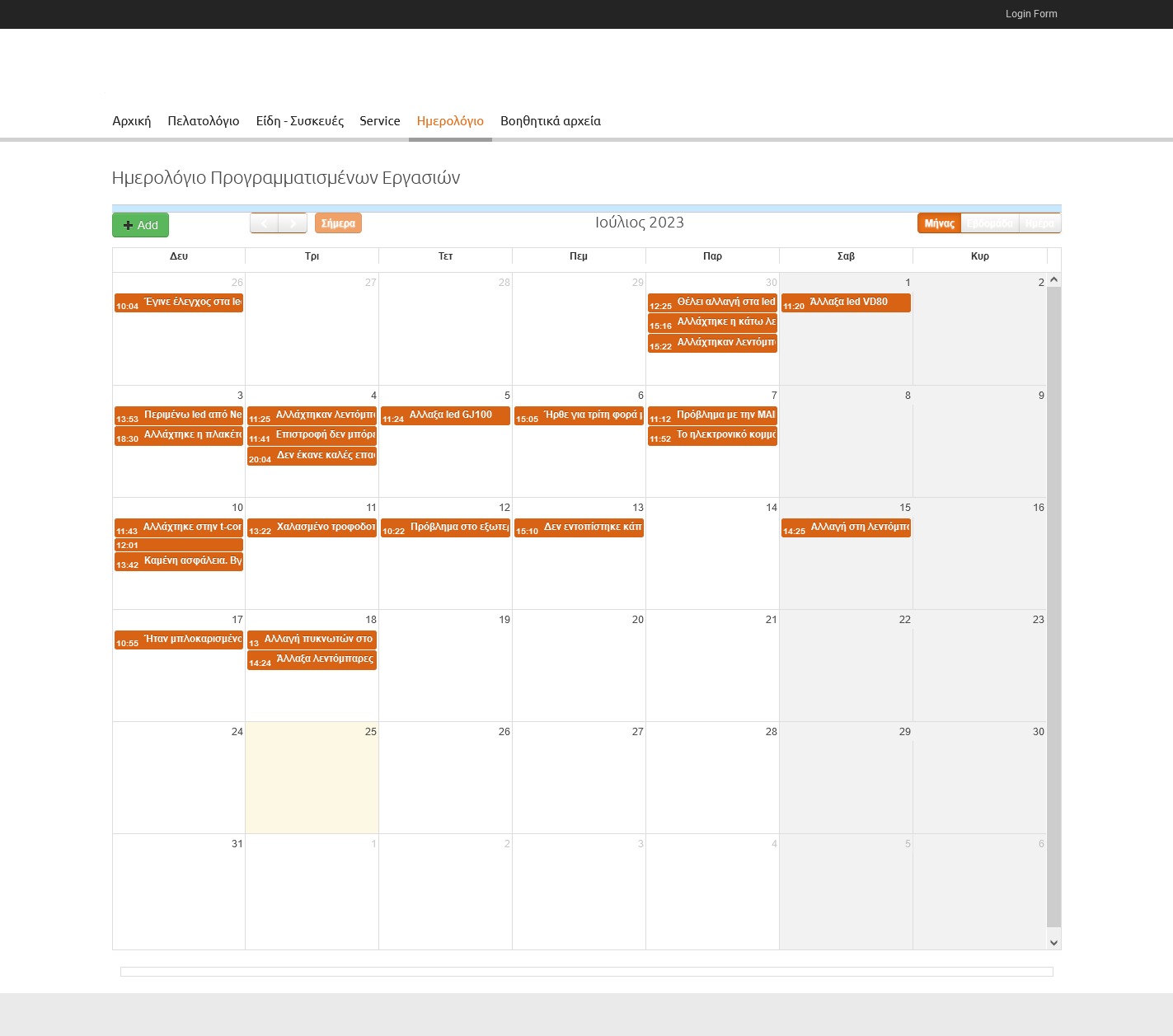 Από το μενού ΗΜΕΡΟΛΟΓΙΟ γίνετε προβολή – εισαγωγή των επισκέψεων που έγινα αλλά και προγραμματισμό των επερχόμενων. Πατώντας το κουμπί που βρίσκεται πάνω δεξιά μπορείτε να προσθέσετε μια νέα επίσκεψη-service