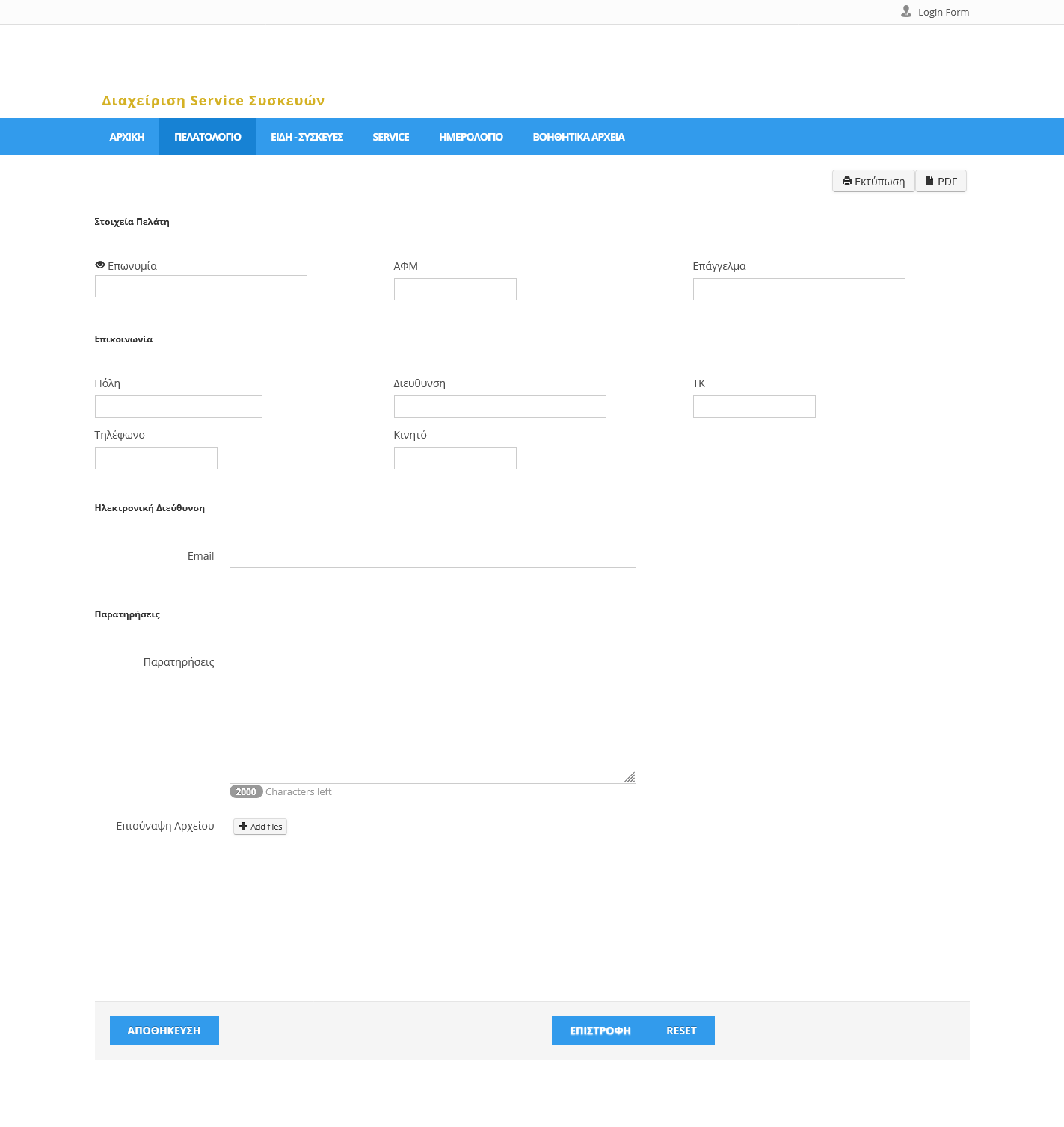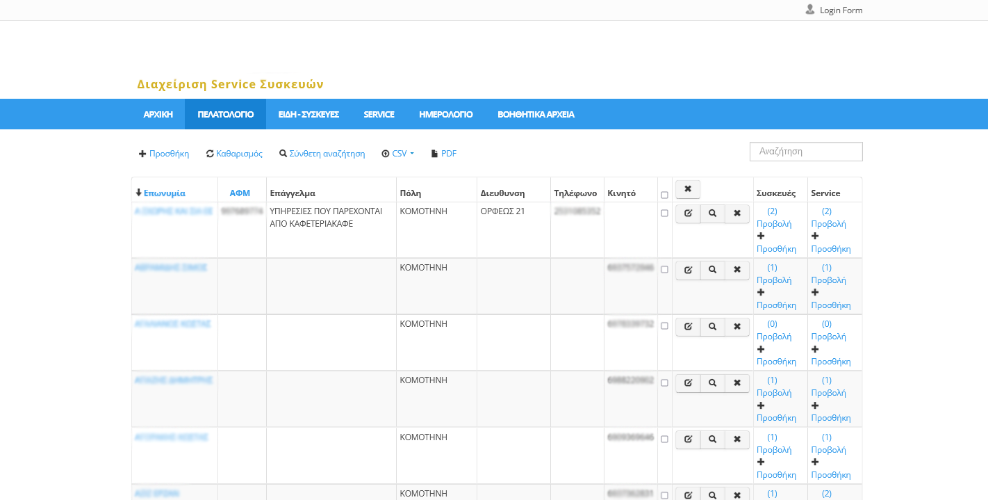 Από το μενού ΠΕΛΑΤΟΛΟΓΙΟ  καταχωρούμε τα στοιχεία του πελάτη και γίνεται  αντιστοίχιση με τις συσκευές του
