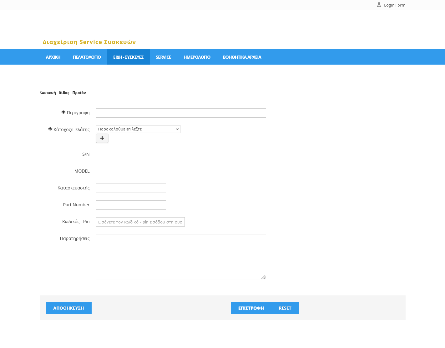Στο μενού αυτό γίνεται η καταχώρηση των συσκευών/υπολογιστών δηλώνοντας τα απαραίτητα στοιχεία (S/N, model, part number κτλ)  και αντιστοιχίζοντας την κάθε συσκευή με τον αντίστοιχο πελάτη.